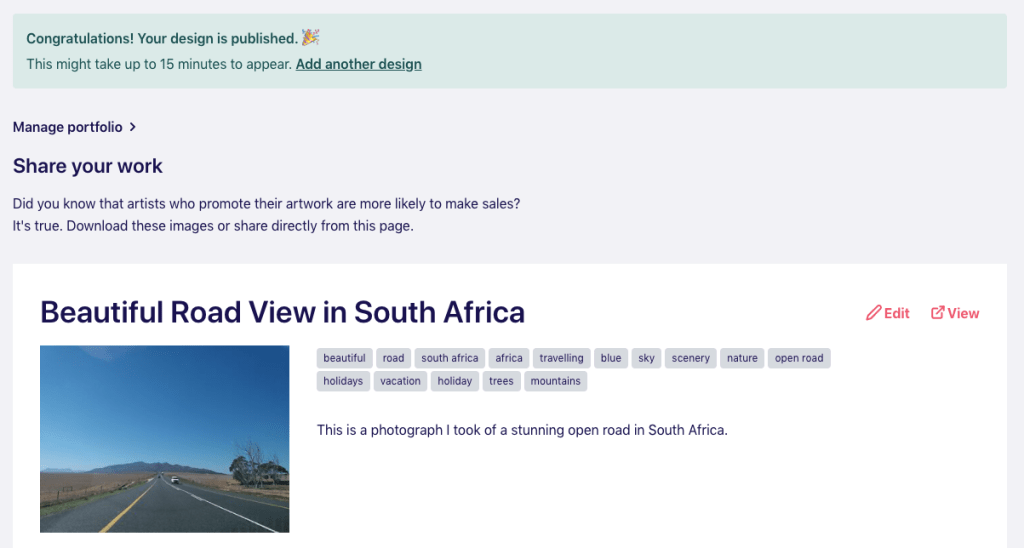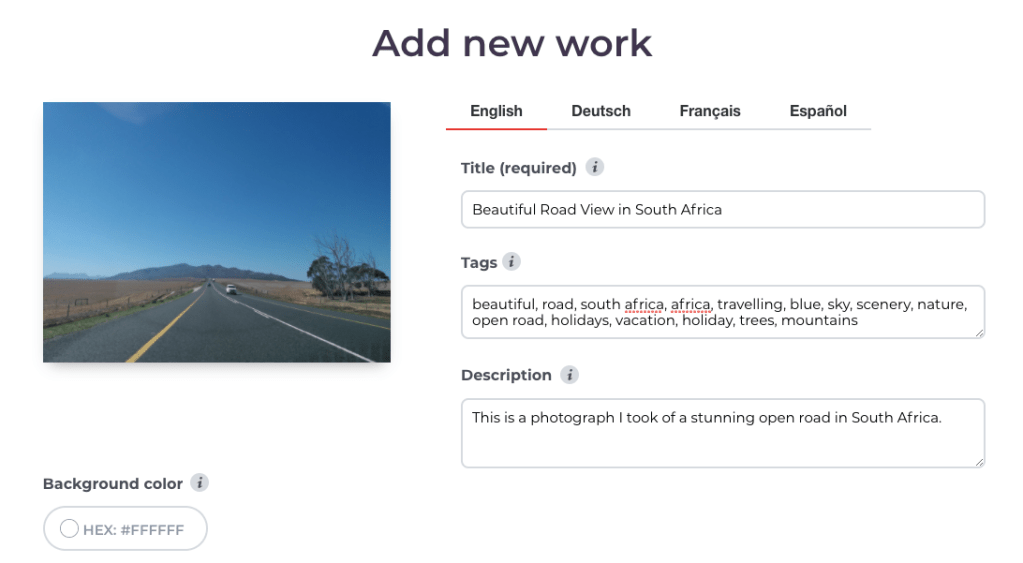 2. Add a descriptive title for your design. Then add about 15 tags that capture any colours and themes related to your design. Also add a short description.