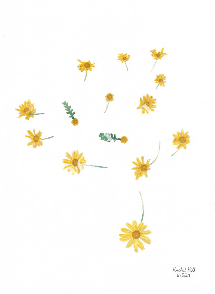 This is an original watercolour painting of african daisies. The painting measures 21cm (width) by 28.6cm (height) in its natural form and appears on 250g/m² Daler Rowney mixed media paper. I don’t offer full framing, but this painting can be mounted on request. Mounting costs extra. If you would prefer a mounted print, contact me directly.